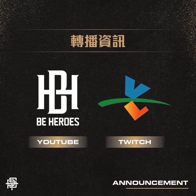 轉播平台:BE HEROES YouTube頻道/緯來體育台Twitch
