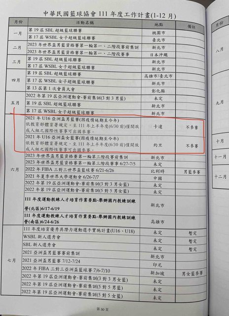 中華籃協111年度工作計畫記載「依教育部體育署規定,111年上半年度(6/30前)僅開放成