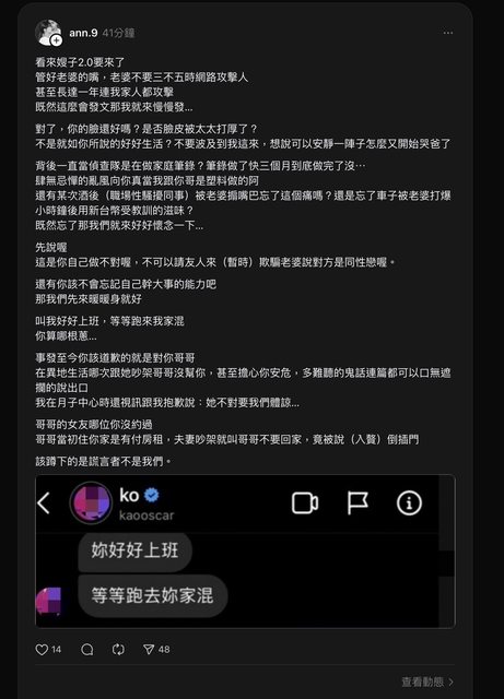原文: 看來嫂子2.0要來了 管好老婆的嘴,老婆不要三不五時網路攻擊人 甚至長達一年連我家人都攻擊 既然這麼會發文那我就來慢慢發… 對了,你的臉還好嗎?是否臉皮被太太打厚了? 不是就如你所說的好好生活?不要波及到我這來,想說可以安靜一陣子怎麼又開始哭爸了 背後一直當偵查隊是在做家庭筆錄?筆錄做了快三個月到底做完了沒肆無忌憚的亂風向 你真當我跟你哥是塑料做的阿 還有某次酒後(職場性騷擾同事)被老婆搧嘴巴忘了這個痛嗎?還是忘了車子被老婆打爆 小時鐘後用新台幣受教訓的滋味? 既然忘了那我們就來好好懷念一下… 先說喔 這是你自己做不對喔,不可以請友人來(暫時)欺騙老婆說對方是同性戀喔。 還有你該不會忘記自己幹大事的能力吧 那我們先來暖暖身就好 叫我好好上班,等等跑來我家混 你算哪根蔥… 事發至今你該道歉的就是對你哥哥 在異地生活哪次跟她吵架哥哥沒幫你,甚至擔心你安危,多難聽的鬼話連篇都可以口無遮 攔的說出口 我在月子中心時還視訊跟我抱歉說:她不對要我們體諒… 哥哥的女友哪位你沒約過 哥哥當初住你家是有付房租,夫妻吵架就叫哥哥不要回家,竟被說(入贅)倒插門 該蹲下的是謊言者不是我們。 https://i.imgur.com/22bnaam.jpeg