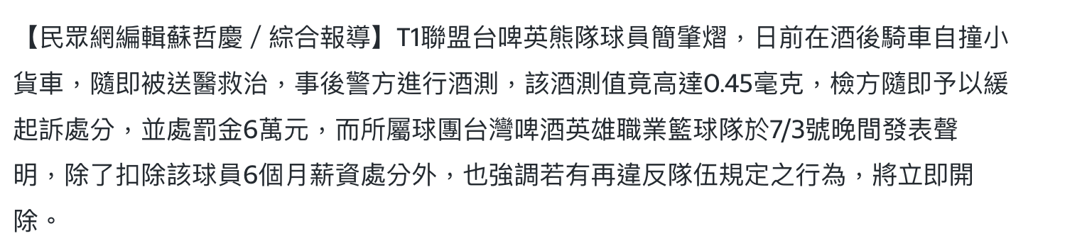噓 GLung : 拒測就代表沒有更嚴重的法律事實聯盟懲處還比酒駕小 09/10 19:10