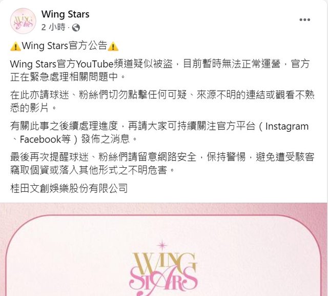 Wing Stars官方YouTube頻道疑似被盜,目前暫時無法正常運營,官方正在緊急處理相關