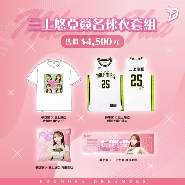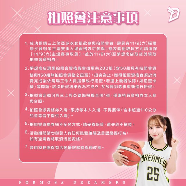 1. 成功預購三上悠亞球衣套組欲參與拍照會者,需具有11/9 (六)福爾摩沙夢想家主場賽事入場資格方可參與。球衣套組取貨方式請選擇【11/9(六)主場賽事取貨】,並於11/9(六)至夢想商店取貨與領取拍照會資格券。