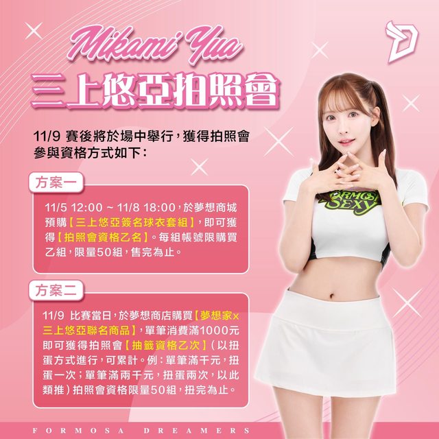 11/9(六)比賽當日,於夢想商店購買「夢想家X三上悠亞 聯名商品」,單筆消費滿一千元,即可獲得拍照會抽籤資格乙次(以扭蛋方式進行,可累計 ex: 單筆滿千元,扭蛋一次;單筆滿兩千元,扭蛋兩次,以此類推),扭完為止。