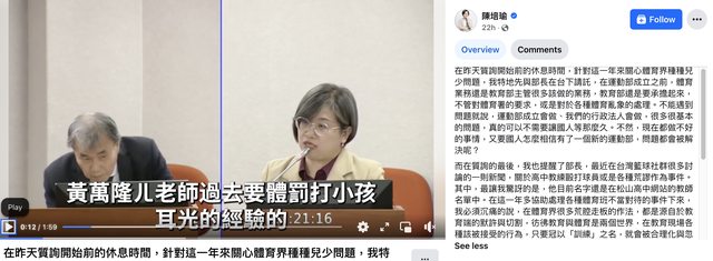 : 週三,立委陳培瑜質詢教育部長 「黃萬隆打小孩耳光的事件」