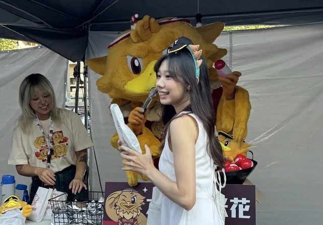 TAYUAN和哥哥一樣活潑,賣雞米花時狂撒胡椒粉,幫女球迷加料時還會配上愛心,逗趣肢