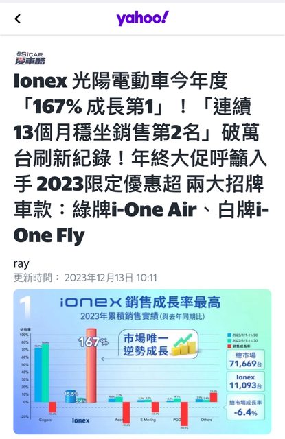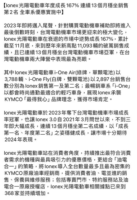 光陽電動車市佔連續13個月的第二名………. 不曉得這個慶祝宣傳的梗在哪邊? 感覺光陽什麼都能發新聞稿,真的好厲害! https://tw.news.yahoo.com/amphtml/ionex-%E5%85%89%E9%99%BD%E9%9B%BB%E5%8B%95%E 8%BB%8A%E4%BB%8A%E5%B9%B4%E5%BA%A6-167-%E6%88%90%E9%95%B7%E7%AC%AC1-%E9%80%A3% E7%BA%8C13%E5%80%8B%E6%9C%88%E7%A9%A9%E5%9D%90%E9%8A%B7%E5%94%AE%E7%AC%AC2%E5% 90%8D-011600930 https://i.imgur.com/afE852D.jpg