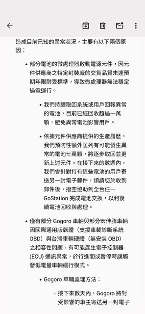 gogoro有發email說明了, 看起來不是電池本身的問題, 是控制電路板上的某顆元件有問題, 會針對這顆元件更換, 而且也不是所有的車種都會遇到斷電。 這樣的說法各位買單嗎? https://i.imgur.com/ryYz4hN.png