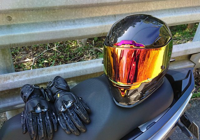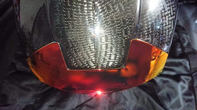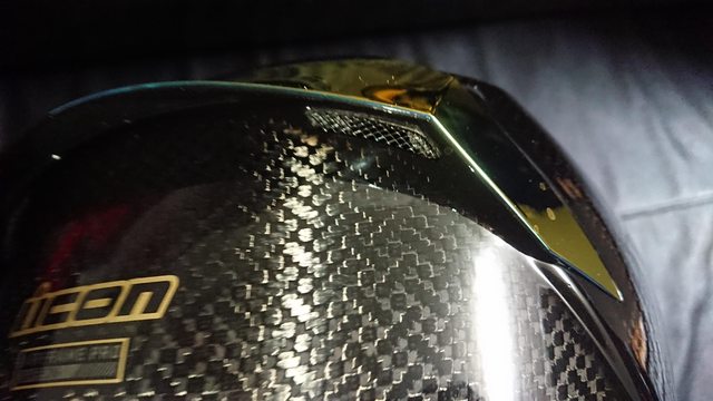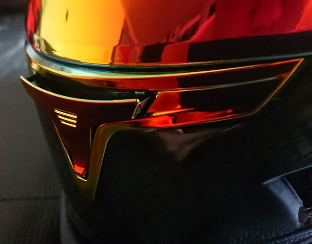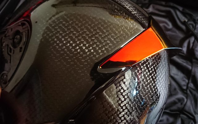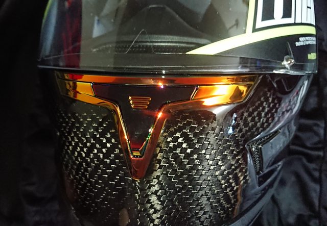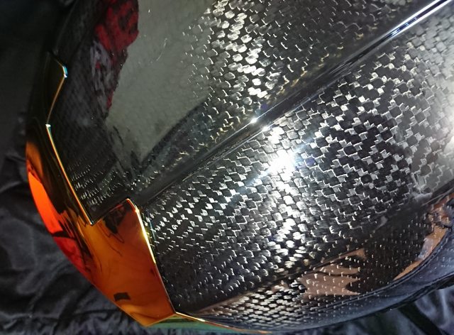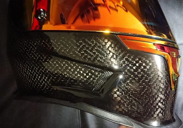 安全帽本體, 因為室內光源實在有夠難拍,直接拿一張外面拍的頂著。 配色整體是亮面碳纖維原色,搭配一些電鍍紅的開關配件來點綴。