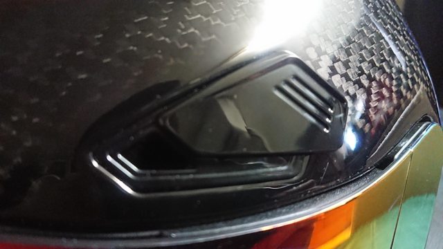 額頭進氣,採用滑蓋式的開關設計,共有四個大的進氣口。 手感上還行,實際騎乘上,戴手套的狀態下操作沒有太大問題。