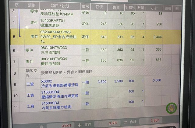 上次做過4萬公里大保了 請問以下工單除了換機油以外哪些可以刪呢? 冷氣循環清洗那個是必要的嗎 再麻煩各位不吝賜教 感謝! https://i.imgur.com/QJnMhbz.jpg