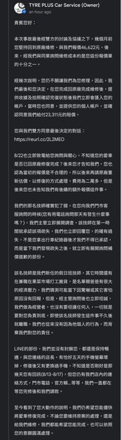 原po跟店家雙方同意賠償金額23311元 讓我們重新理一下時間序 1.原Po牽車回家發現有傷 2.打給店家 店家問當事技師 技師才坦承有撞到 3.初次原廠報價單為46622元 店家跟原Po喬好維修金額23311元 4.等待維修? 然後原po說line被封鎖 5.8月22上午原po ptt發文說被封鎖 沒說雙方已經協議好維修金額 6.8月22中午店家看到google評論後後打給原po 店家說店長的手機8/13-8/17送修 官方line正常 電話暢通 店面營業 沒有封鎖 只是在等原po維修後的收據請款 後來原po才說有進原廠二次估價 費用為2萬多 目前原po有沒有修好還是店家有沒有匯款都不清楚 8.待續 站在店家立場 23311元吞了 沒有不負責 沒有封鎖你 店面都有營業 電話暢通 https://i.imgur.com/IBr81sE.jpg