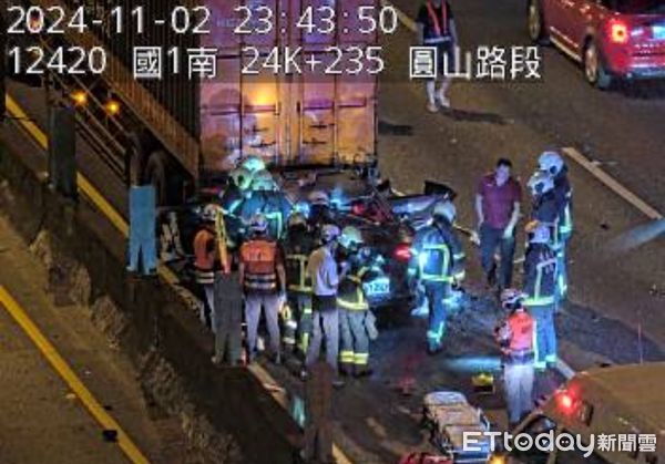 → cosmite: ▲國1圓山段賓士轎車插進大貨車尾,車頭夾扁駕駛傷重不 11/03 10:34