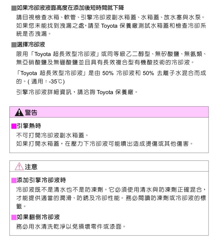→ f023221: 豐田原廠說明書,只能補原廠比例配好的冷卻水 11/16 20:31