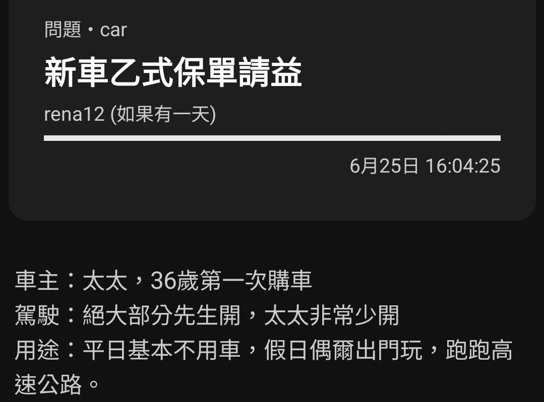 → rena12: 抱歉 因為剛買車不清楚修理保險這類的事情 聽了業務跟朋 11/18 13:53