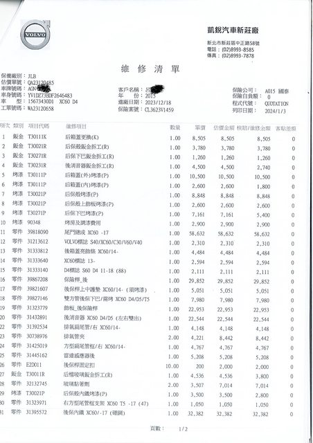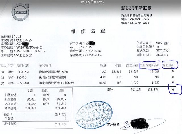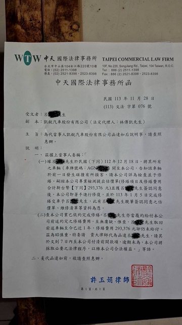 : : 113/11/28 新莊Volvo委託中天法律事務所要求我方附全額維修費