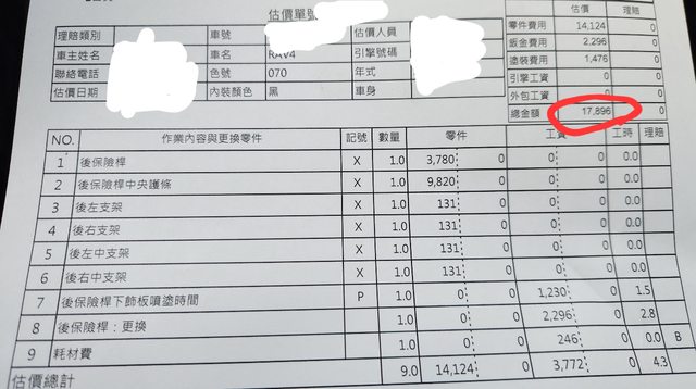 → dai26: 那張估價單一點都不重要,因為都保險處理啊 12/05 18:04