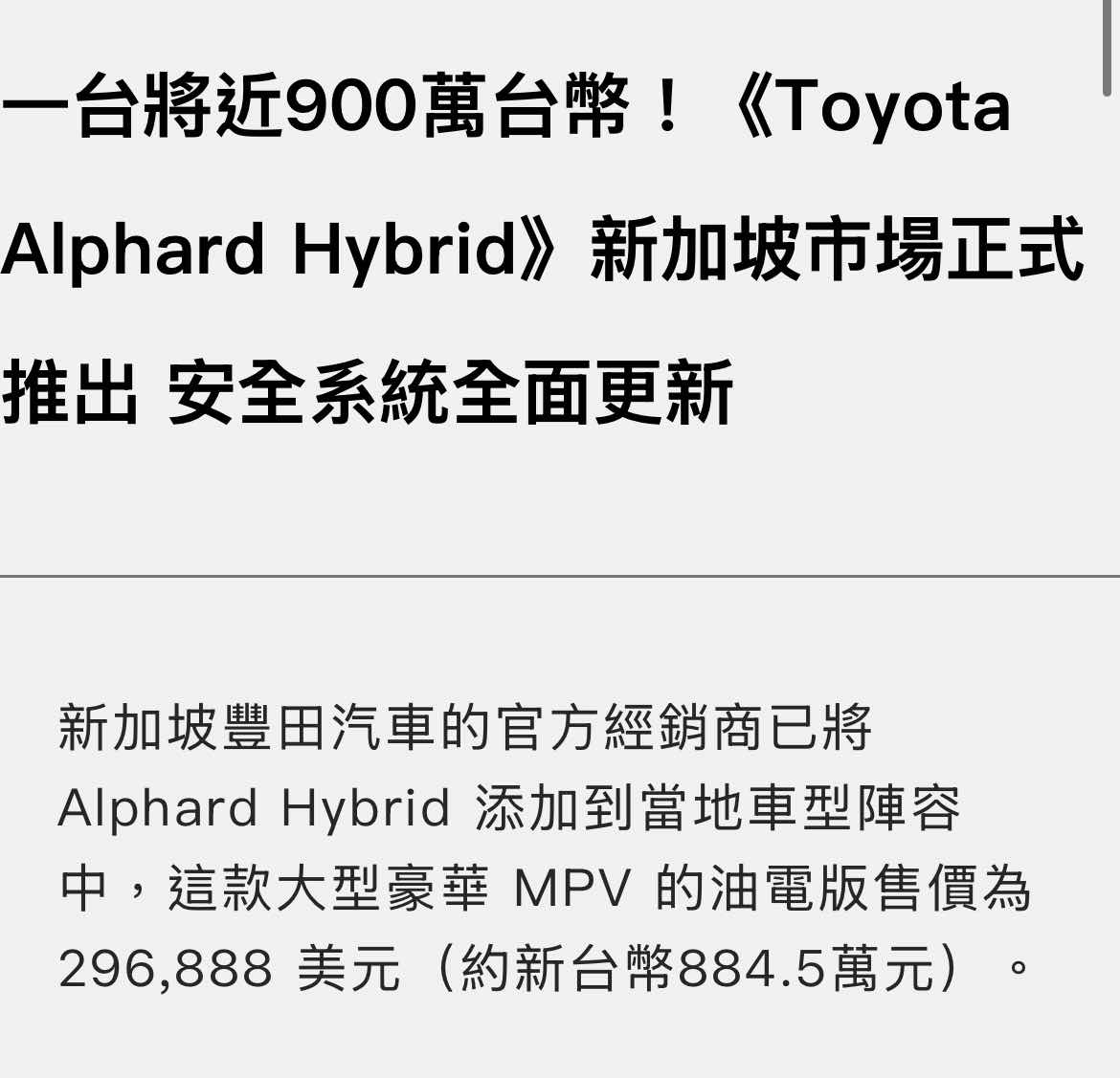 → a27588679: alphard hybrid 884.5萬等於46個月的薪水 03/03 23:22