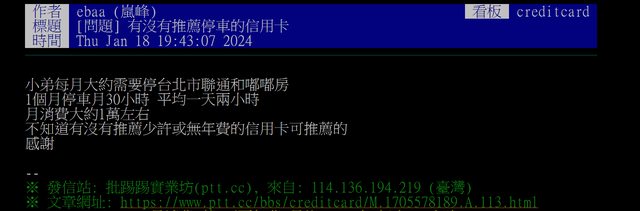 #1bgGxD4J (creditcard) 1/18 ebaa □ [問題] 有沒有推薦停車的信用卡