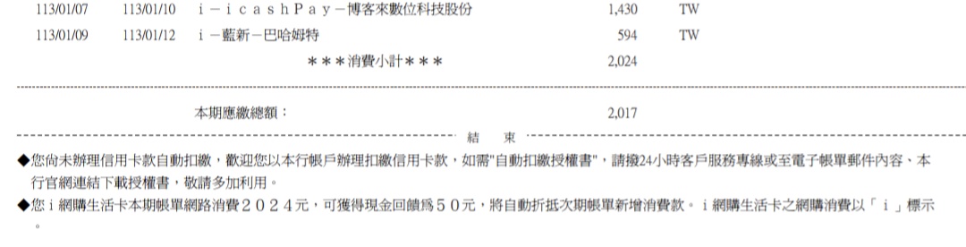 推 ctes940008 : 原來一月沒有?「i網購生活卡113年1月帳單結帳週 02/07 13:34