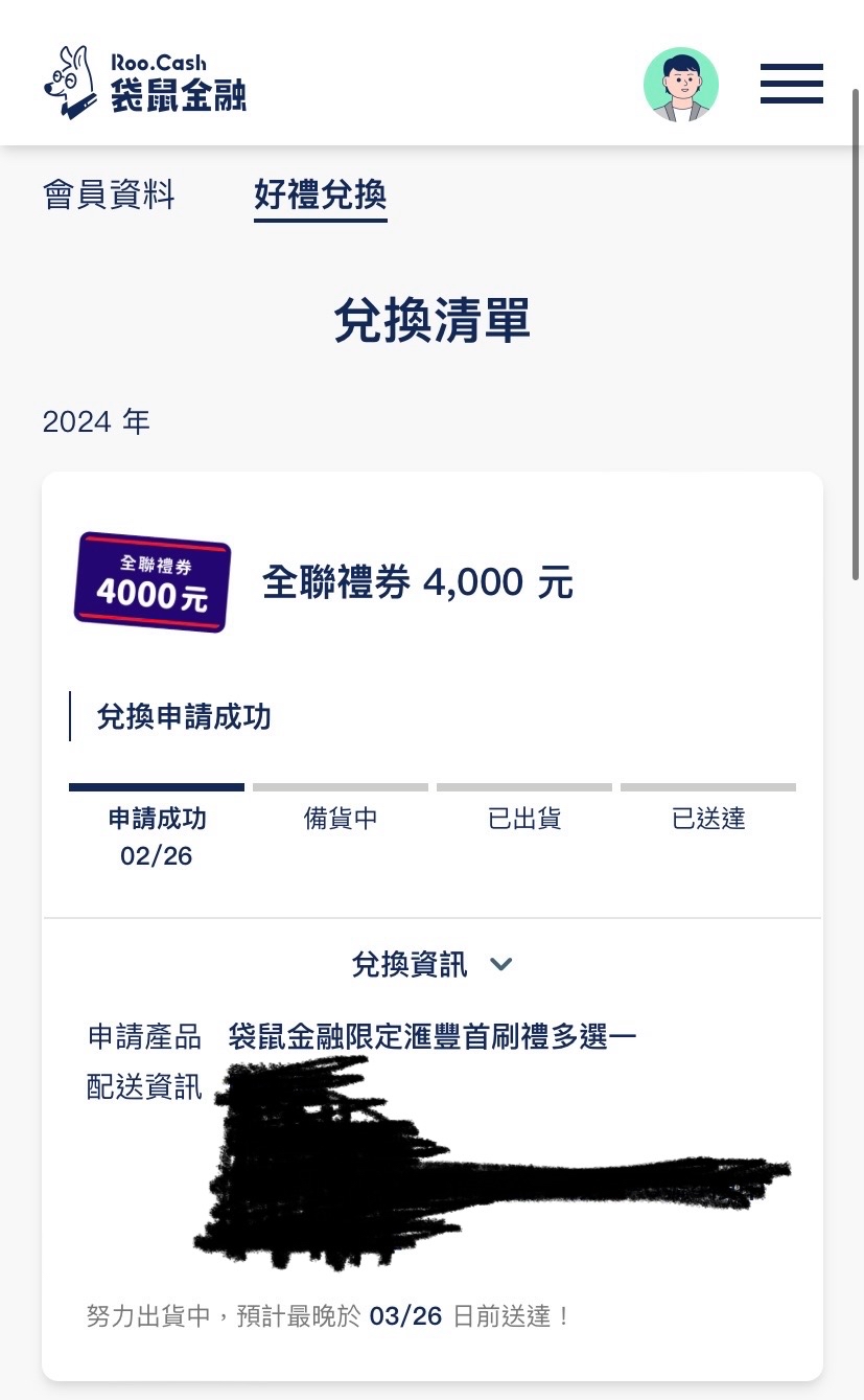 → ruby02162000: 剛收到袋鼠的兌換簡訊,填完後顯示努力於3/26前送到02/26 16:32