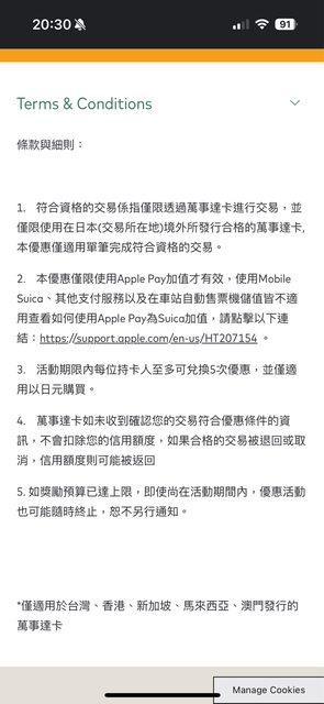 分享新發現 客服回信說2月份的額度在2/16額滿(免登錄版本) 剛好3月初儲了2筆,結果有收到免登錄的回饋 所以回饋額度是每個月分開的喔~~ —————————————————— 原文吃光光 前面幾篇的推文有不少人回報收到2筆回饋 因為前陣子的回饋有點問題 聯繫客服後才知道原來Mastercard 同時推了兩個活動,都是儲3000回200(日幣) 一個是原文的活動 環球賞平台,需註冊登錄後才享有回饋 https://specials.priceless.com/zh-tw/offers/JR_EAST_%E6%9D%B1%E6%97%A5%E6%9C%A C%E6%97%85%E5%AE%A2%E9%90%B5%E9%81%93_(SUICA)_?Oid=202303130008&issuerId=&prod uctId= (縮網址:https://reurl.cc/OG8RoX ) 注意事項有註明限台灣發行的卡 另一個是Mastercard Specials https://specials.priceless.com/zh-tw/offers/JR%E6%9D%B1%E6%97%A5%E6%9C%AC%E6%9 7%85%E5%AE%A2%E9%90%B5%E9%81%93%E6%A0%AA%E5%BC%8F%E6%9C%83%E7%A4%BE_(Suica)?Oi d=202310310002&issuerId=&productId= (縮網址:https://reurl.cc/xLjKb4https://i.imgur.com/KfrMyPV.jpg