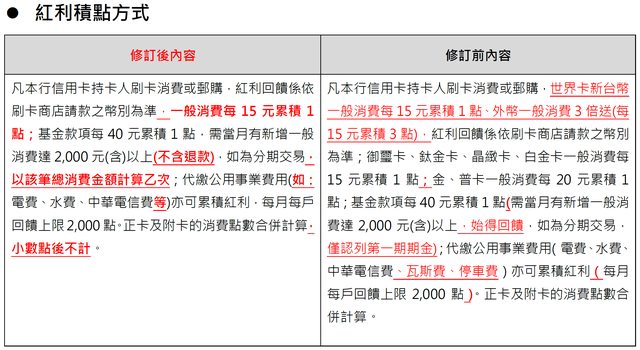 Ref. https://card.firstbank.com.tw/sites/card/zh_TW/1565702150875 第一銀行信用卡權益提前公告 發布日期 2024年04月01日 公告內容 因應本行信用卡系統升級優化,提前公告調整本行「信用卡約定條款」及紅利積點方式, 調整後內容請參閱「第一銀行信用卡權益提前公告」,調整後內容自新系統上線基準日起 生效,新系統上線基準日將另於本行官網公告。若您對本次修訂內容有任何異議,請於生 效日前依信用卡約定條款第二十一條所定方式通知本行終止契約(若未通知則視為同意) 。 PDF文件下載:https://card.firstbank.com.tw/sites/card/files/1565702364238 - 紅利積點方式修訂後內容:https://i.imgur.com/WrqI1vG.png