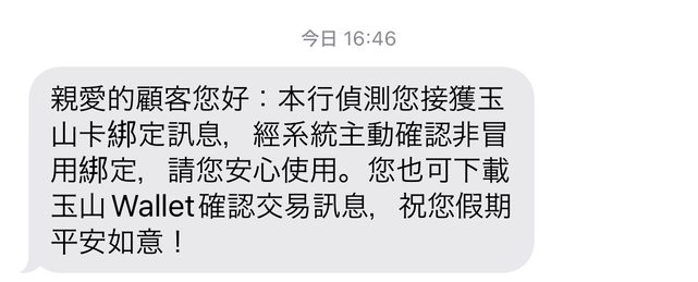 收到玉山最新的訊息 「 親愛的顧客您好:本行偵測您接獲玉山卡綁定訊息,經系統主動確認非冒用綁定,請您安心 使用。您也可下載玉山 Wallet確認交易訊息,祝您假期平安如意! 」 https://i.imgur.com/qzGnqaL.jpg