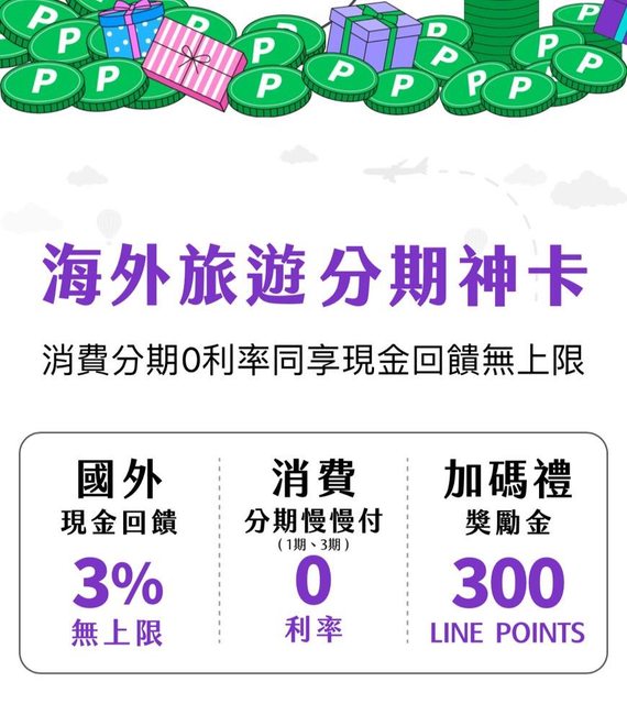 ■Bankee海外旅遊分期神卡  核卡即享,海外旅遊指定神卡超好用  1.海外3%現金回饋無上限。   國內刷也好用,1.2%現金回饋無上限。  2.消費分期0利率同享現金回饋無上限。   1期/3期0利率,分期金額同享國內1.2%、海外3%回饋。  3.最高2000萬旅平險,出國旅遊超實用 ■申辦加碼禮活動辦法 【活動時間】 2024/03/01(五) 00:00 - 2024/07/03(三) 23:59 【活動內容】 活動對象:活動開始前未曾持有 Bankee 信用卡並透過活動指定連結申辦信用卡之全新客 戶。 活動回饋條件:凡於活動期間內透過本活動頁面指定連結申辦 Bankee 信用卡,並於活動 截止日前使用 LINE Pay 綁定 Bankee 信用卡付款成功,消費累計滿新臺幣 600 元(含) 以上者,即送 300 點 LINE POINTS 點數,每人(卡)限領取乙次。 提醒您,除 Bankee 信用卡帳單列示應繳金額外,遠東商銀不會透過簡訊、電子郵件及電 話向您額外收取任何費用。 回饋時間與發放時間:符合本活動回饋條件者,遠東商銀將於 2024/07/31 前以簡訊發 送 LINE POINTS 點數 300 點兌換序號至您留存於遠東商銀 Bankee 之手機門號。 ■資訊來源 Bankee官網 https://bit.ly/43ItiZq -- ※ 發信站: 批踢踢實業坊(www.ptt-web.org.tw), 來自: 42.72.203.185 (臺灣) ※ 文章網址: https://www.ptt-web.org.tw/creditcard/M.1712630810.A.389