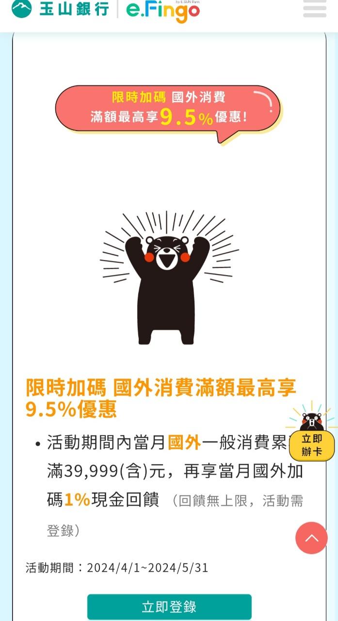 catuncle1 : 其實很多人盲目辦熊本熊雙幣卡,主要就是看到那1.5% 04/16 22:23
