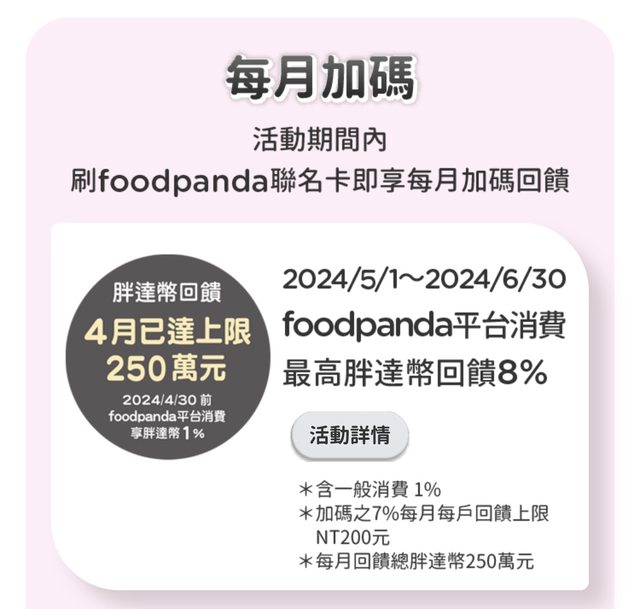 → yaliu : 但我發現月底也可以用,因為通常次月回饋,我上月27 04/17 18:54