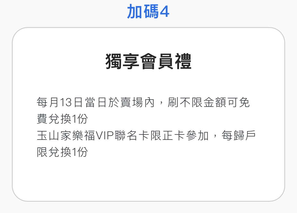 → kkkk1234 : 卡付款POS也是會送會員禮 不過不知道完全沒辦這張 04/30 21:35
