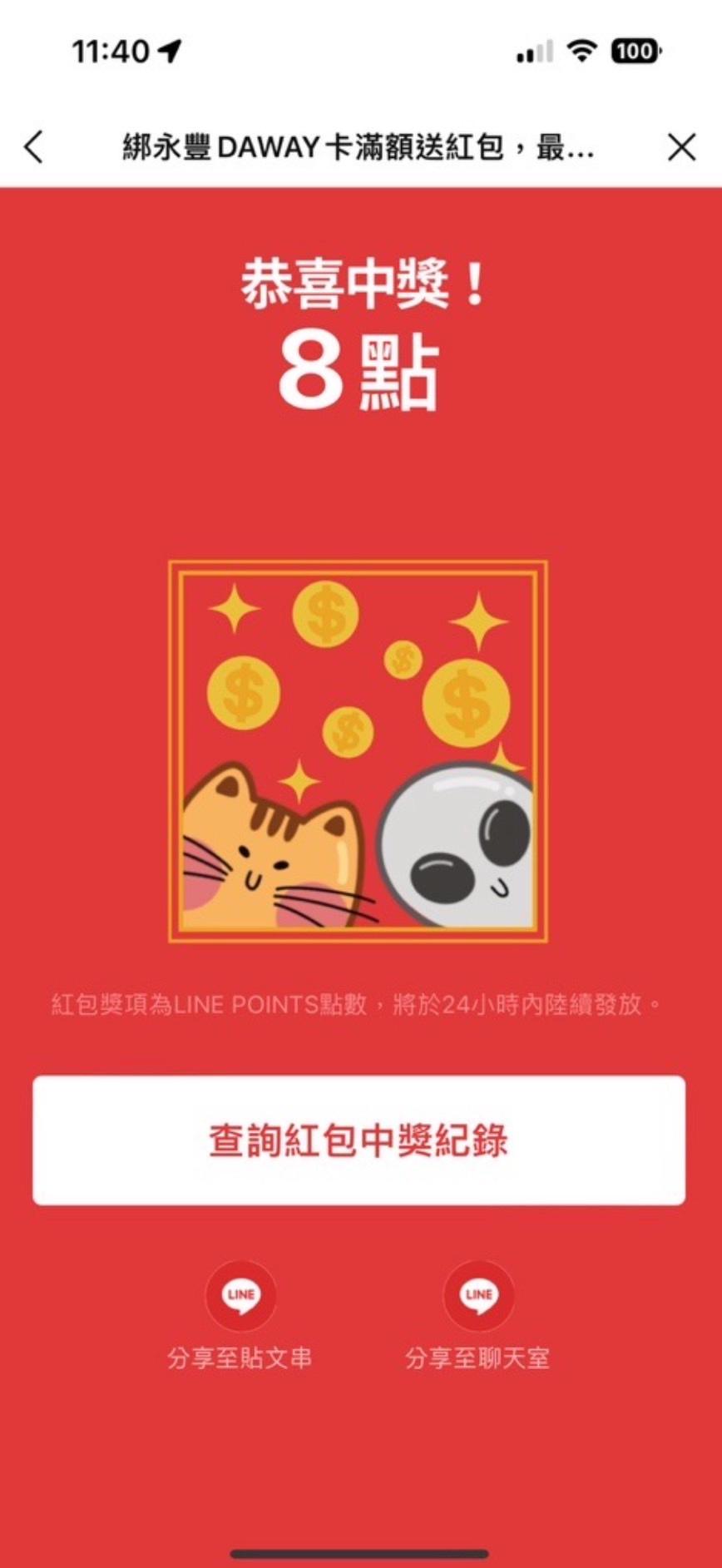 標題[心得] 永豐DAWAY卡 發紅包LINE POINTS點數實測