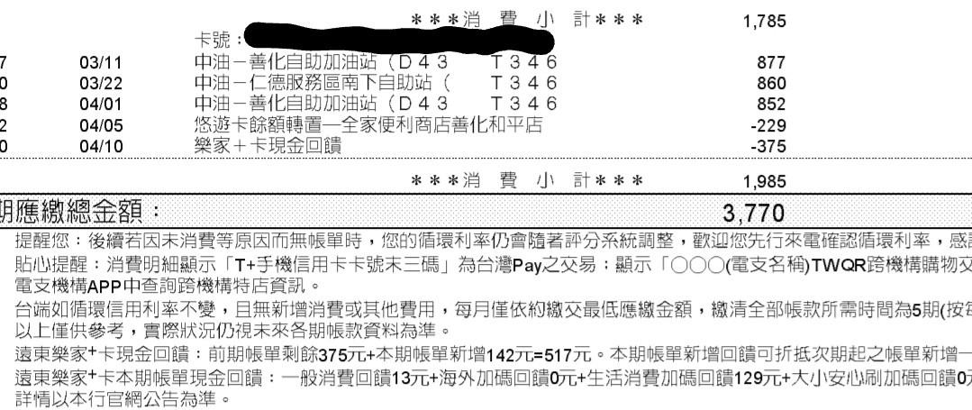 → charles3067 : 服對答案。遠東只要注意不要被回饋扣到當期不用繳 05/02 12:15