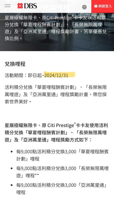 星展銀行官網上已經將紅利兌換哩程的活動期間延長至2024/12/31。