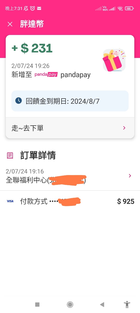 → emissary : 昨天買全聯,沒多久就收到回饋250胖達幣,速度很快 07/02 18:59