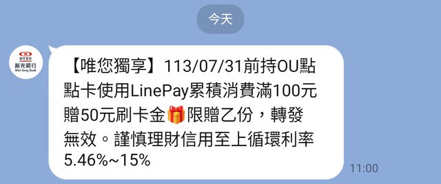 推 TZUYIC : 新光現在改用LINE個人化服務推播刷卡分眾活動,上次 07/04 11:20
