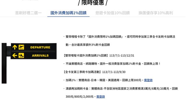 113/7/1-113/12/31,不論實體商店、網路購物,國外一般消費皆享加碼1%刷卡金,回饋