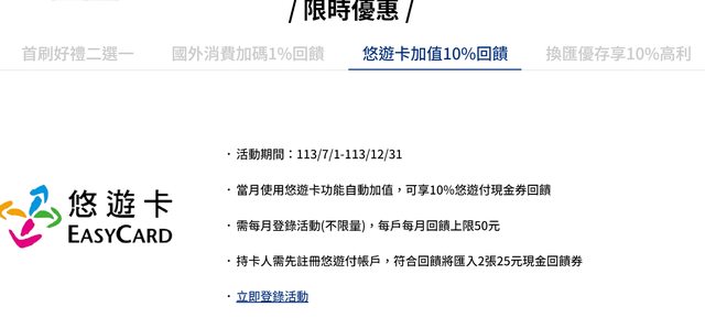 持卡人需先註冊悠遊付帳戶,符合回饋將匯入2張25元現金回饋券