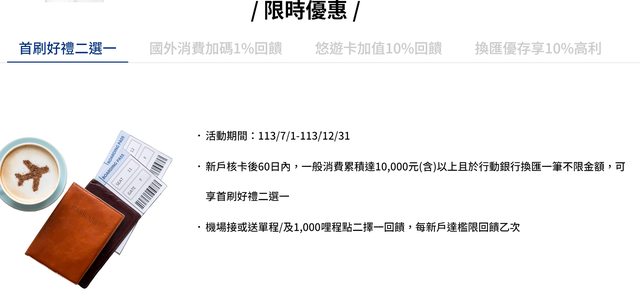 新戶核卡後60日內,一般消費累積達10,000元(含)以上且於行動銀行換匯1筆不限金額,