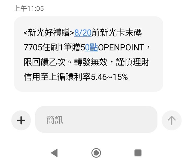 → lingsk : 今天收到新光滿額禮OP50點 可是沒印象有傳簡訊 08/06 17:49