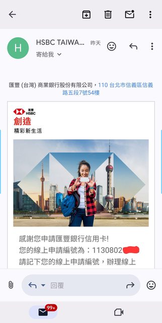 收到的網路申請書通知裡,「滙豐」跟「匯豐」兩種寫法同時存在。