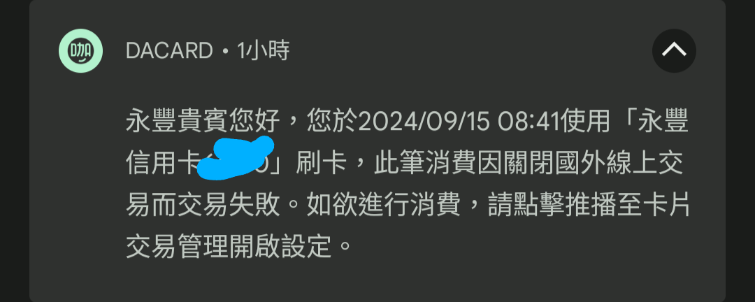 推 Kain123 : 剛才美元幣倍卡被盜刷,這張平常都關著有擋到 09/17 18:02