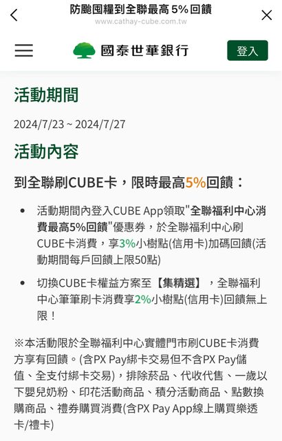 : 切換CUBE卡權益方案至【集精選】,全聯福利中心筆筆刷卡消費享2%小樹點(信用卡)回饋