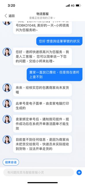 後來我點了淘寶物流客服詢問,德邦客服說他們內部沒有這張單的訊息,可以請賣家提供