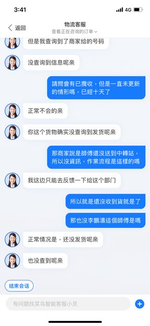 回覆都是物流公司人力不足、尚未中轉出去,要我再等等。