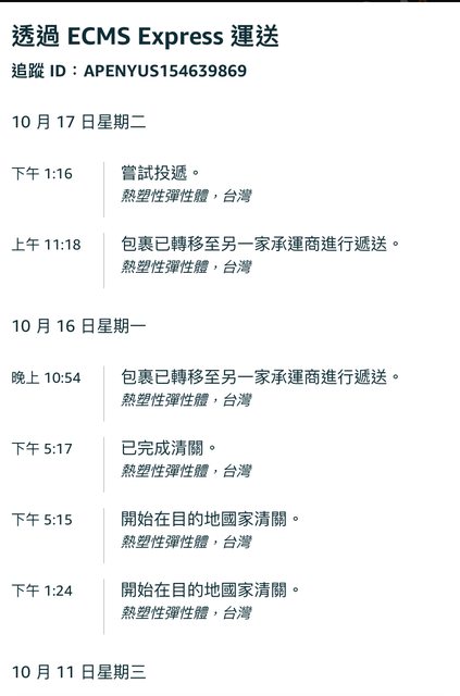 → jenny1768: 想說17號投遞失敗,昨天18也沒收到包裹 223.140.156.56 10/19 15:32