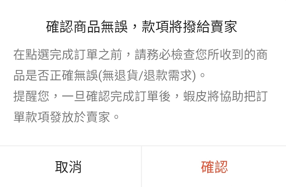 推 wi22900: 按確認收貨就無法了吧,蝦皮那邊也無法介 180.217.4.241 10/23 15:45