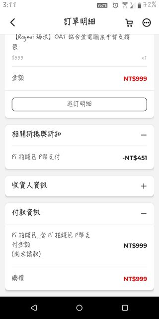 結帳方式是pi錢包 p幣(451)+信用卡結帳=999