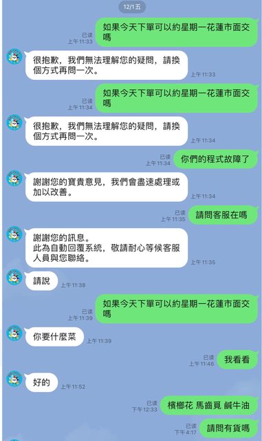 星期五我問客服說我要在花蓮待到星期一(他們花蓮免運費),可以約星期一在花蓮面交