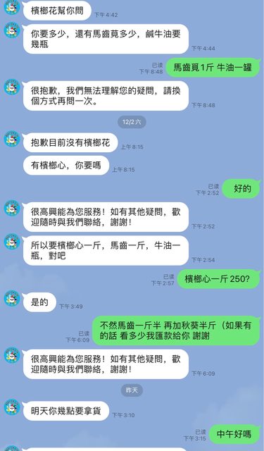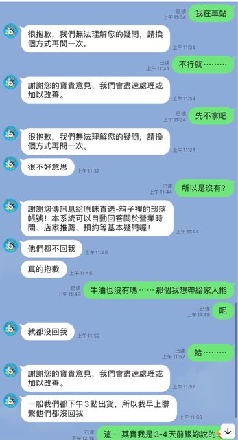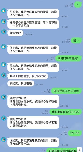 我立刻回我星期一中午好嗎?又沒回應到隔天中午上午才說農家都沒回應他沒有辦法出貨